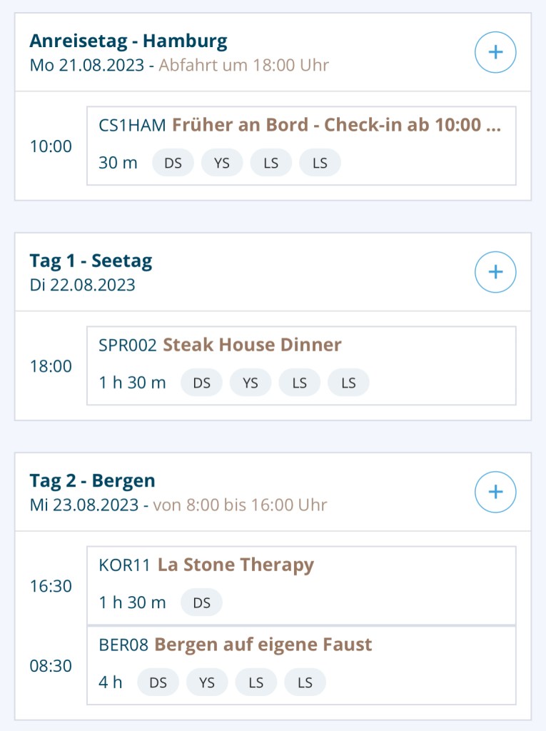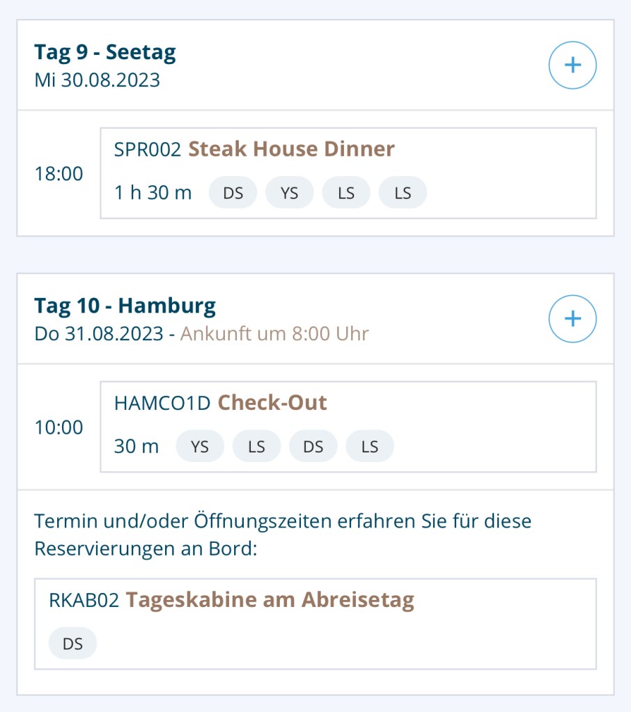 Da wir unseren Urlaub von Beginn an genießen und so lange wie möglich erleben wollen, haben wir einen Parkplatz direkt am Cruisegate Steinwerder und die frühstmögliche Check-Inn Zeit, um 10:00 Uhr, gebucht und am Abreisetage eine Tageskabine, um nicht schon um 10:00 Uhr von Board gehen zu müssen, sondern noch in Ruhe die letzten Stunden genießen und etwas essen zu können, bevor wir uns auf die Heimreise, zurück nach Kelkheim, machen.