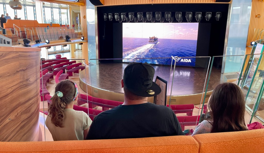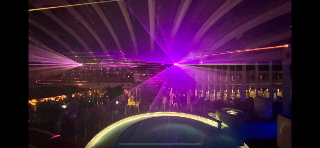 Den Abend ließen wir dann mit einem Eis an der schiffseigenen Eisbar und einer Lasershow im Beach-Club ausklingen. Zum Einschlafen schauen wir nun an jedem Abend die AIDA Prime Time Show, bei der die Entertainment Managerin des Schiffs um 20:00 Uhr einen Gast zu einer kurzen Talkrunde im Theatrium empfängt und die AIDA Shows, die an jedem Abend unter einem anderen Motto stehen.