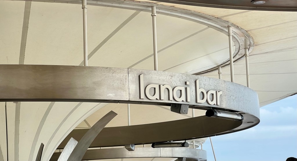Der erste Weg führte uns ins Theatrium, wo wir uns erst einmal niederließen, die beeindruckende Bühne und die Bars studierten. Weiter ging es, vorbei am Restaurant French Kiss, in Richtung Lanai Bar, die Bar am Heck des Schiffes mit einem tollen Ausblick auf die Heckwelle; so das Schiff auf See ist.