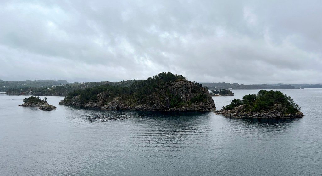 Um 5:30 Uhr wurde ich wach und schaute als erstes, ob schon Land in Sicht war. Und tatsächlich konnte man in weiter Ferne Land sehen. Um 06:15 Uhr zogen SID und ich die Vorhänge auf und genossen sowohl von innen, als auch auf dem Balkon die Einfahrt nach Bergen. Unsere Mädels schliefen noch tief und fest und bekamen auch unsere begeisterte Unterhaltung nicht mit; was für ein Ausblick! In der Dämmerung sah man kleine rote Häuser, welche vereinzelt in der grünen Landschaft standen. Wir kamen Bergen immer näher.