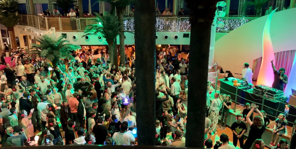 Wir überlegten, was wir mit dem angebrochenen Abend noch anfangen könnten und entschlossen uns dazu, uns Kopfhörer für die bekannte Silent Party im Beach Club zu holen. Die Warteschlage war bereits sehr lang, aber alle Wartenden wurde mit Kopfhörern ausgestattet. Um 22:00 Uhr begann die Party. Für jeden der nun den Beach Club ohne Kopfhörer betrat, muss es ein komisches Bild gewesen sein. Wir tanzten alle zu verschiedenen Musikrichtungen, doch der rote Kanal war wohl der Beliebteste, der „Schlager-Kanal“. 75% des Beach Clubs grölten zu Schlagern wie „Atemlos“, „Laila“ oder „Flieger-Lied“. Während Leny es etwas peinlich war, wie der Rest ihrer Familie mitsang und feierte, genoß Lya den freien Platz zum Tanzen. Es war ein riesen Spaß! Nachdem Lya langsam müde wurde, entschieden wir uns noch einen kleinen Snack zu holen und gingen auf die Kabine.