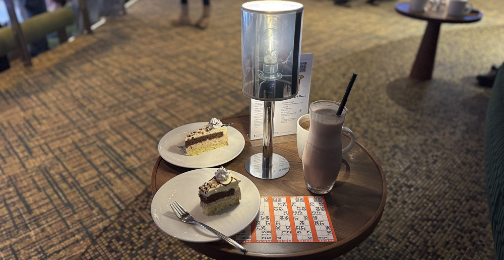 Auf einem gemütlichen Sessel und der dazugehörigen Couch im Theatrium wurden wir dann mit Kuchen, Torte und Drinks verwöhnt. Wir waren recht lange im Theatrium, da wir auch direkt das BINGO dort verfolgt haben. Leider haben wir diesmal, mit nur einem Schein, nichts gewonnen, aber es folgen ja noch ein paar Bingo-Runden, bei denen wir unser Glück auf den € 7.000,- Jackpot (Stand: 30.12.2024) herausfordern können.