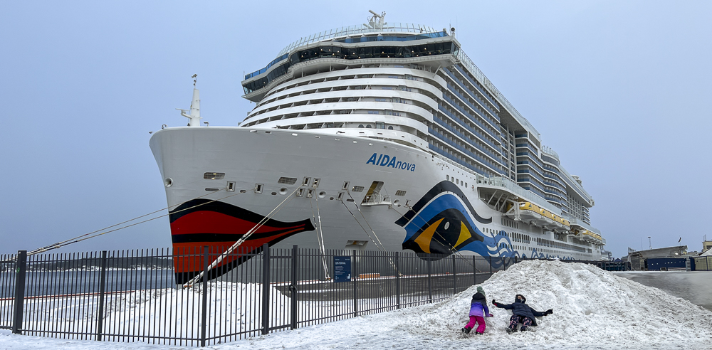 Auf dem Rückweg zum Schiff liefen wir durch verschneite Gassen und entdeckten viele kleine Details in der Stadt. Natürlich lebt so ein Cruise-Terminal vom Tourismus und somit steht direkt am Anleger ein großer Container mit Souveniers.