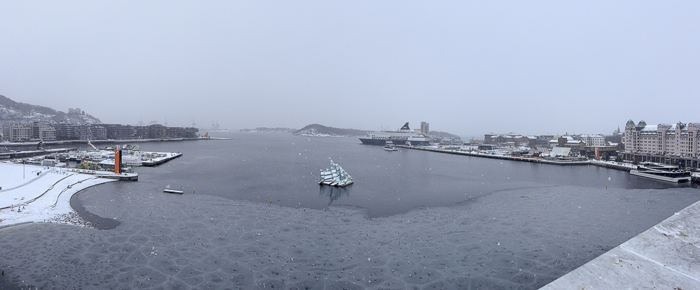 Am ersten Tag des Jahres muss man einfach ausschlafen. Als wir gegen 11:00 Uhr aufwachten, gab es natürlich kein Frühstück mehr. So entschieden wir uns, einfach im Fuego Mittagessen zu gehen. Bei Aida wird aber so sehr auf alle geachtet, dass es kein Problem war, für Lya noch Nutella zu bekommen; somit wurde unsere Mahlzeit einfach ganz entspannt zum Brunch. Nachdem wir uns gestärkt hatten, packten wir uns dick ein, sehr dick ein, und verließen das Schiff in Richtung Oslo Zentrum. Auf dem Hinweg nutzten wir ein Taxi, welches uns direkt vor dem Opernhaus von Oslo raus ließ. Hier tobten Leny und Lya sofort im Neuschnee und verewigten sich als Schneeengel auf einer Schrägen der Oper.