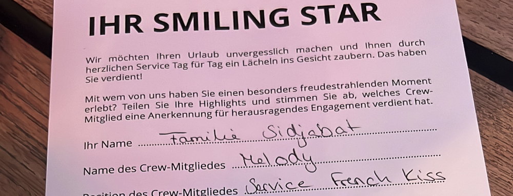 Während SID seine Massage genoss, bin ich mit Lya und Leny übers Schiff gelaufen, um zwei Formulare für den Smiling Star auszufühlen. Wir haben einmal Melody aus dem French Kiss und einmal Orlando aus dem Yacht Club ausgewählt, die unsere Reise, besonders für unsere zwei Mädels, bereits zu etwas Besonderem gemacht haben und uns immer wieder herzlich begrüßen, wenn wir sie sehen.
