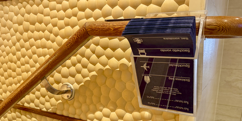 An den Geländern in den vielen Treppenhäusern wurden Kotztüten aufgehängt, die bei Bedarf, das Schiff sauber halten sollen ;-). Wir sind wirklich sehr gespannt was uns nun, mitten auf der Nordsee, erwartet, denn auch alle Pools wurden bereits geleert und alles an Deck und im Inneren des Schiffes wurde gesondert gesichert. Aktuell geht man von Wellen im Bereich der 5 Meter aus. Der Seegang wird also definitiv zu spüren sein und die Gäste sollen sich durch den Seegang nicht die Stimmung vermiesen lassen… We will see and time will tell ;-).