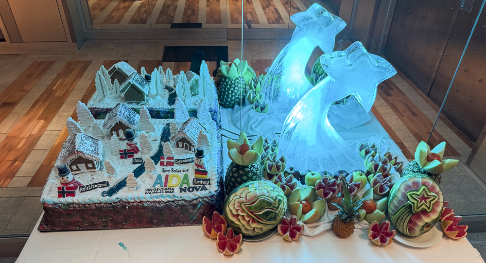 Natürlich darf die bekannte Torte am letzten Tag einer Reise nicht fehlen. Wir fanden sie im Yacht Club und bestaunten das Meisterwerk vom ersten Teil unserer Reise. Der nächste Stopp war das Theatrium, in dem heute eine besondere Prime Time stattfand. Der Smiling Star wurde gekührt, die Crew (jedenfalls ein kleiner Teil) kam auf die Bühne und der Kapitän hielt eine emotionale Rede. Er verabschiedete sich und den General Manager in den wohlverdienten fünfwöchigen Urlaub und fand sehr, sehr feine Worte für seine Crew, die nicht Wenigen einige Tränen in die Augen schießen ließ.