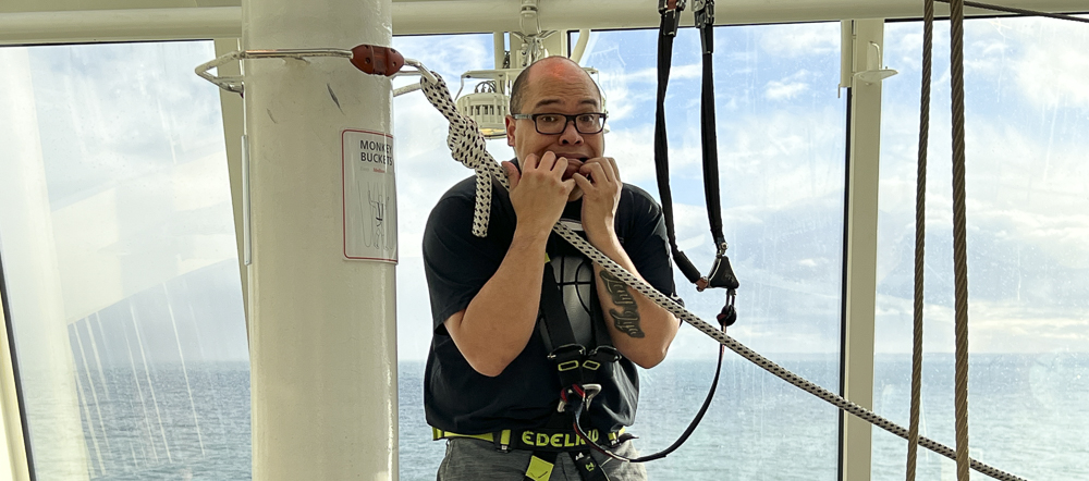 Zurück auf der Kabine haben Leny und ich uns umgezogen, um in den Klettergarten zu gehen. Nach einer kurzen Einweisung, die Leny ja schon zu Beginn der Reise genoss, sind wir, gemeinsam mit Sarah, in den Parcours gestiegen. Die Hindernisse sind alle machbar und machen eine Menge Spaß, wobei das ein oder andere für mich schon tückisch und anstrengend war. Ich bin danach auch erst einmal duschen gegangen ;-).