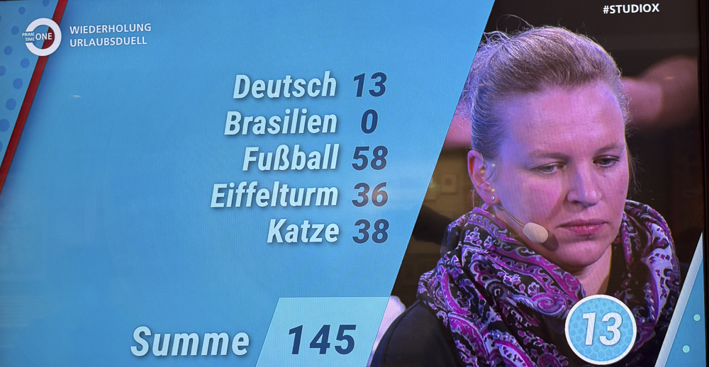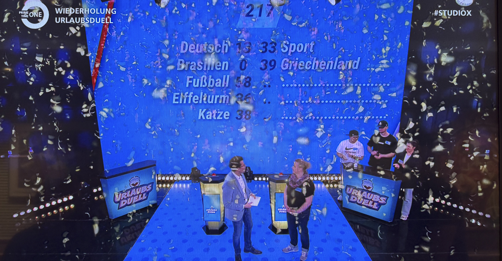 Das letzte Highlight, zumindest das Letzte an dem wir aktiv teilgenommen haben, rückte näher und näher. Unsere Teilnahme an der TV-Sendung „Urlaubsduell“, die an die bekannte TV-Sendung „Familienduell“ aus den 90ern angelehnt ist. Lya, Leny, Jeannine und Oma Moni haben sich einen Platz im Studio X gesucht, während Sarah, Max, Yvonne und ich mit Headsets ausgestattet wurden. Als Team-Namen haben wir uns für „Die SYMS“ entschieden, die Kombination aus den Anfangsbuchstaben unserer Namen. Die Show ging los und wir haben uns durch die vier Runden gekämpft, um tatsächlich ins Finale einzuziehen.