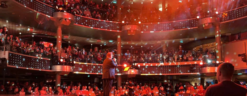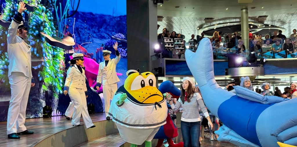 Nach dem Frühstück haben sich meine sieben Lieben einen Platz im Theatrium auf Deck 6 gesucht und ein wenig der nautischen Stunde mit dem Kapitän gelauscht. In weiser Voraussicht hier schon guten Plätze gewählt, für die Clubbie-Parade, die im Anschluss folgen sollte.