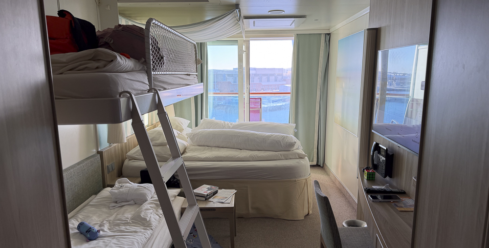 Leny und Lya führten uns zielstrebig, als wären sie nie weg gewesen zu unseren Kabinen. Marcel, Christiane, Lea, Helena und Penelope folgten ihnen und waren fasziniert von der Größe des Schiffs. All unsere Kabinen waren schon bezugsfertig, so dass sich alle erst einmal niederlassen und ihre Klamotten ablegen konnten. Wir haben exakt die Kabine gebucht, die wir auf unserer allerersten Reise auf AIDAperla bezogen hatten; Verandekabine Comfort 11141 auf der Steuerbordseite. Auch hier hat sich sofort ein vertrautes Gefühl eingestellt.
