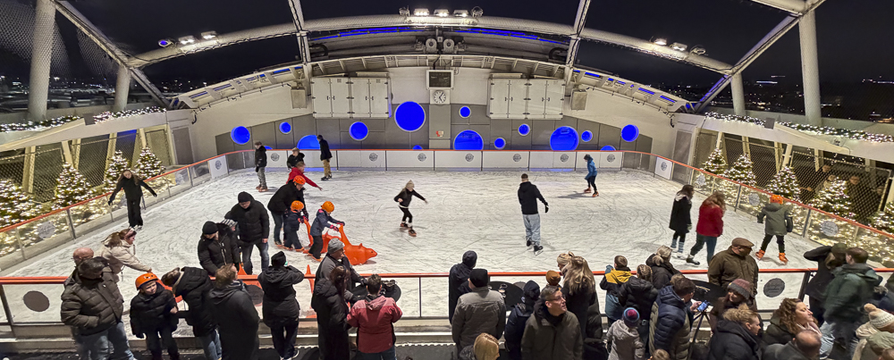 Nach dem die ersten Emotionen verarbeitet wurden, sind wir zum Winter-Wonderland nach oben auf das Sportdeck gegangen. Dort ist eine Eisfläche aufgebaut, auf der man Schlittschuhlaufen kann. Tatsächlich eher nichts für uns, aber an den aufgebauten Buden gab es Glühwein, Waffeln und Bratwürstchen, die wir uns schmecken ließen.