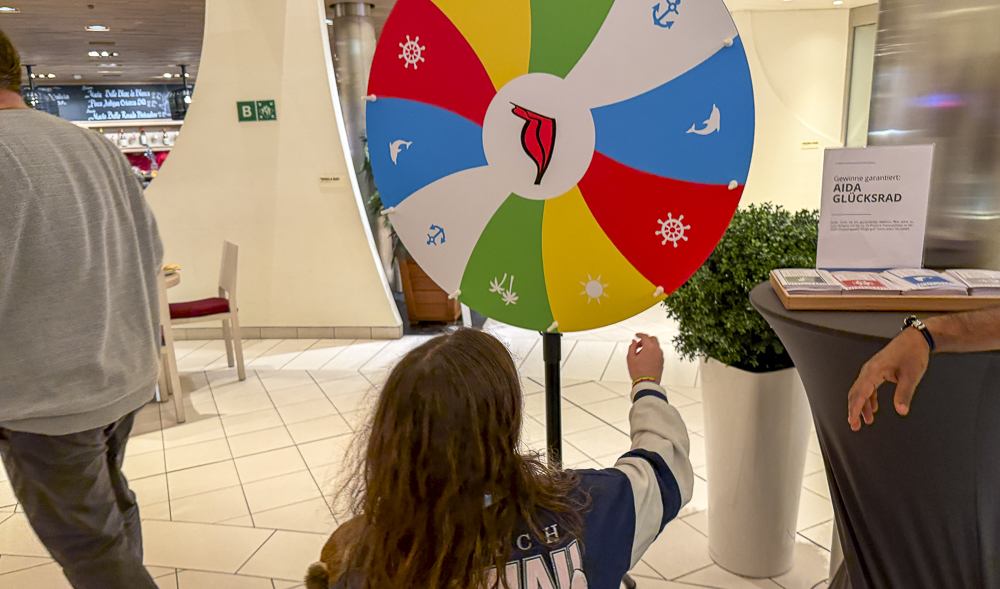 Zurück an Bord verabredeten wir uns mit Lea, Christiane und Marcel im Beachclub. Während wir Cocktails genoßen, tauchten, schwammen, sprangen und entspannten sich die Mädels im Pool. Irgendwann kam der Hunger und wir sind für einen ersten Snack im Fuego eingekehrt. Wir fanden einen Tisch am Fenster und stellten fest, dass wir schon ablegten. Das letzte Ablegen der Reise und wir saßen im Restaurant… Zum Glück waren wir schon fertig, so dass wir schnell auf Deck 6 liefen um dort das gewohnte, letzte „Sail Away“ zu hören. Von dort aus gingen wir ins Casino und kauften für den Abend einen Bingoschein; bei der ersten Bingo-Runde waren wir in der Wellness Suite und konnten deshalb leider nicht mit machen. Lya hat auf Deck 6 auf der Plaza noch schnell am Glücksrad gedreht und traditionell ein paar Gutscheine abgesahnt; da wir uns bereits mit allem was wir uns vorgenommen hatten (Maki Plüschtier, Pandora Anhänger, etc.) versorgt haben, hat Lya die Gutscheine zu den anderen gesteckt, die sie noch von der AIDAperla und AIDAnova in ihrer Kulturtasche hatte.