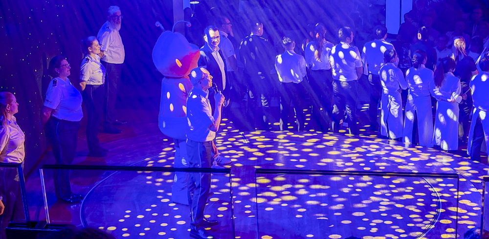 Wir trafen uns auf Deck 7 und suchten uns einen Platz für die Prime Time. Der Smilling Star ging an die Tanzlehrerin der Reise. Nach dem einige Aufnahmen der Reise gezeigt wurden, untermalt mit dem bekannten AIDA Song „Richtung Horizont ins Glück“, sang ein Crew Mitglied „My Way“. Ein kleiner Teil der Crew stand vor der Bühne und wedelte mit Fähnchen. Dies ist immer der Moment, in dem man realisiert, das war die letzte Show für diese Reise und alle im Theatrium werden ganz emotional.